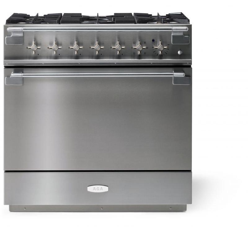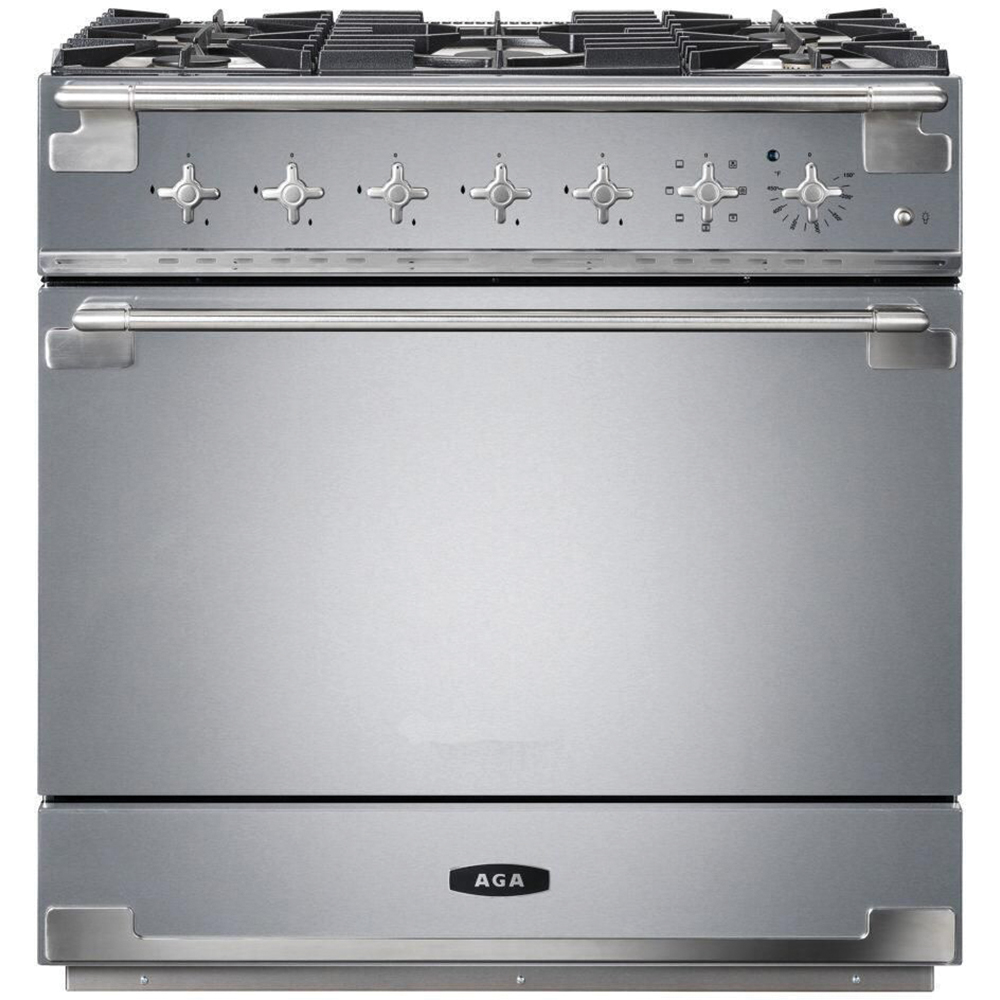The AGA Elise 36" Dual Fuel Model features one large multifunction oven with seven settings including true European dual-convection cooking, fan-assisted baking, browning, thaw and serve, convection broiling, warming, and conventional cooking. A continuous cast-iron cooktop features five powerful sealed-brass burners providing easy cleanup and preventing messy spills from reaching the oven or internal components.