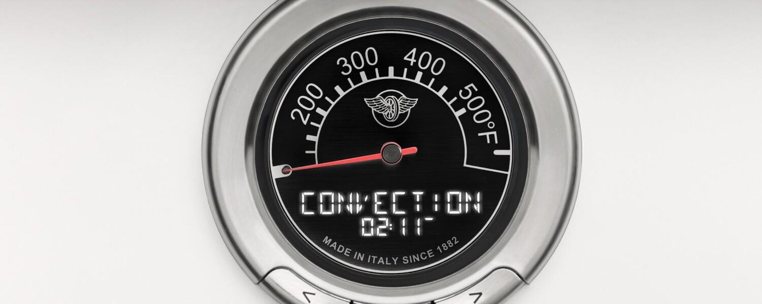 The 4.7 cubic feet main oven cavity is the largest in its class, with dual convection fan for balanced airflow and even temperature baking and roasting on 7 shelf levels. The elegant digital gauge gives precise control of oven temperature during pre-heating, roasting and baking, and has integrated controls for the food temperature probe. The extra wide infrared gas broiler is ideal for grilling and searing at high heat. The 2.4 cubic feet auxiliary oven is perfect for smaller dishes and for warming. Both ovens include convenient features such as smooth telescopic glides for the oven shelves and soft-close doors. The edge-to-edge interior oven glass door maximizes interior volume and can be wiped clean without effort.