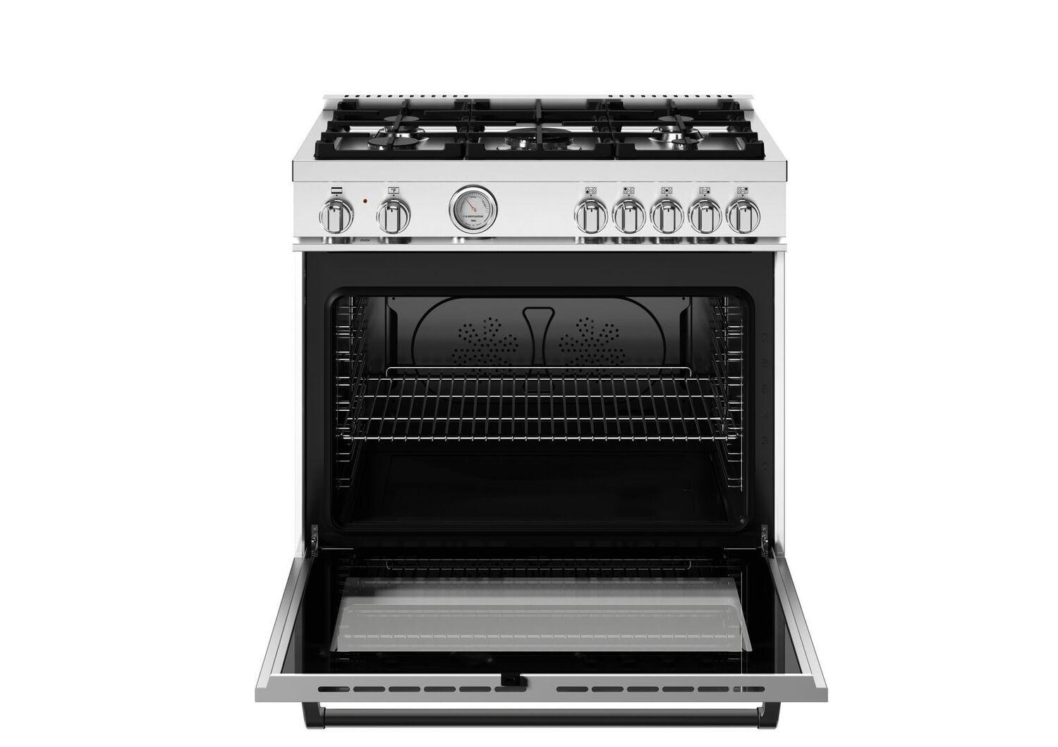The 5.9 cubic feet oven cavity is the largest in its class, with dual convection fan for balanced airflow and even temperature baking and roasting on 7 shelf levels. The elegant temperature gauge for control of oven temperature during pre-heating and baking is a signature of every Bertazzoni range. The extra wide electric broiler with optional convection is ideal for grilling and searing at high heat. The oven includes convenient soft-motion doors. The edge-to-edge interior oven glass door maximizes interior volume and can be wiped clean without effort.