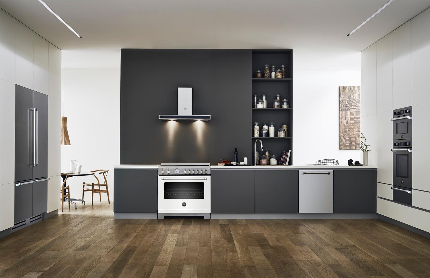Bertazzoni Master Series ranges are percision-engineered for performance and design that will bring a professional touch to your kitchen. The induction cooktop uses electromagnetic energy to turn the pots themselves into the actual heat sources. It's fast and safe. The oven features an electric broiler with an extra-wide European convection fan for balanced air-flow. This allows ensures even heat distribution for single and multi-level roasting and baking. The useful self-clean cycle incinerates all grease and dirt residues in the oven cavity and returns the oven to its original shine. Included with the oven is a telescopic glide shelf and soft-close door hinges for easy one handed operation. The door features edge-to-edge tempered glass windows to minimize heat loss. The range features large round metal knobs and unique handles that match perfectly with the many other Master Series products offered by Bertazzoni.