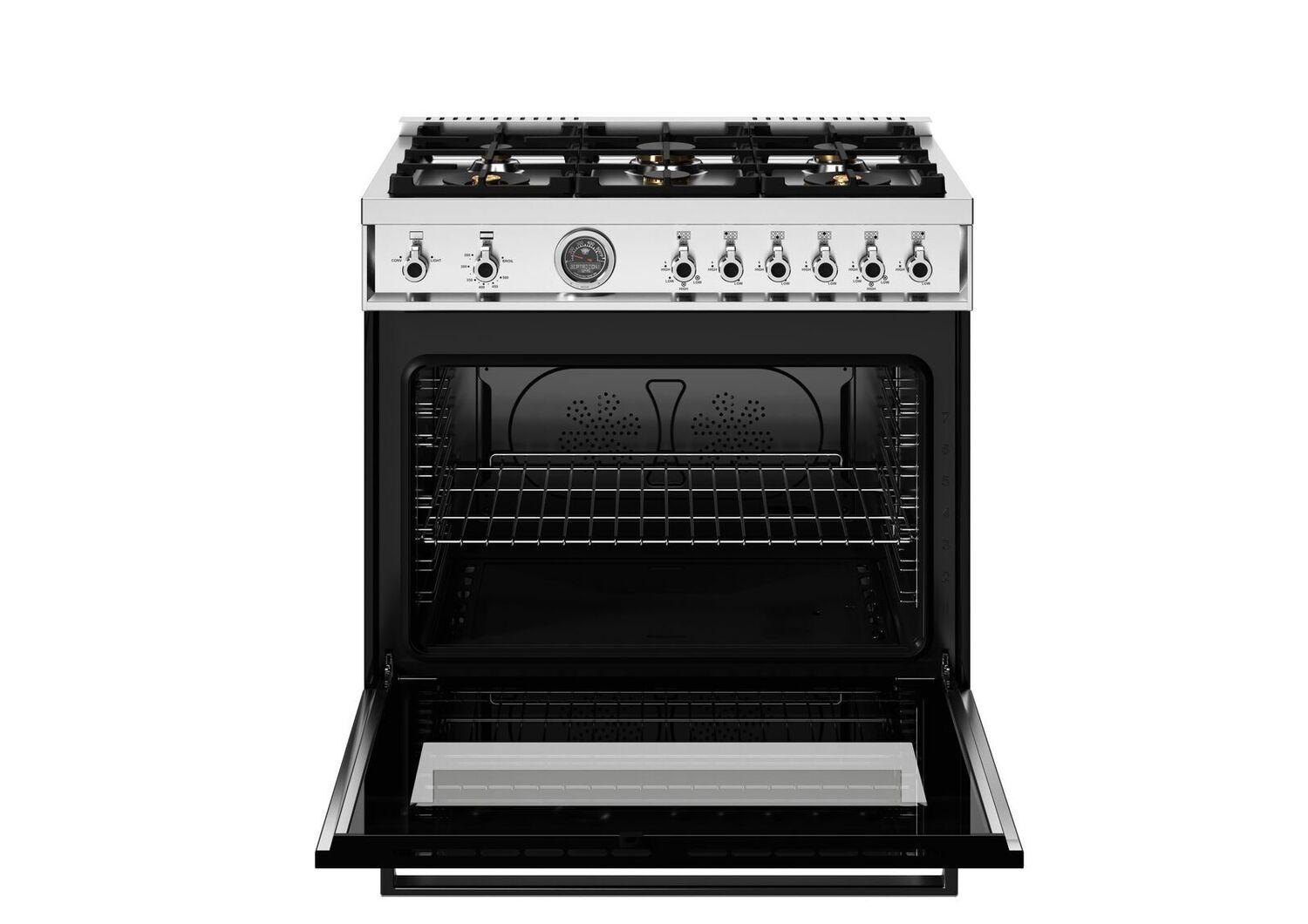 The 5.9 cubic feet oven cavity is the largest in its class, with dual convection fan for balanced airflow and even temperature baking and roasting on 7 shelf levels. The elegant large temperature gauge monitors the actual temperature in the oven. The extra wide infrared gas broiler is ideal for grilling and searing at high heat. The oven includes convenient features such as smooth telescopic glides for the oven shelves and soft-close doors. The edge-to-edge interior oven glass door maximizes interior volume and can be wiped clean without effort.