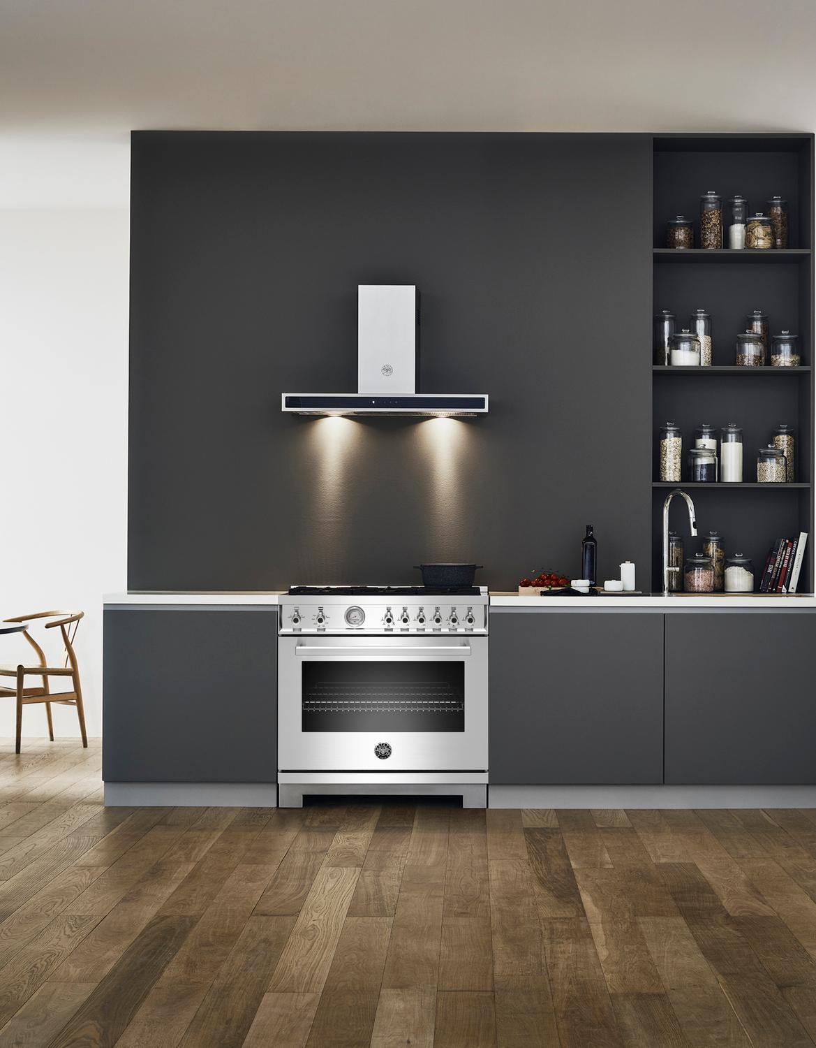 Bertazzoni Professional Series ranges bring the authentic experience of Italian cooking into your home. The cooktop is designed for versitility and efficiency. The dual-ring power burner is a high-efficiency burner with separately controlled flames can handle both delicate simmering and powerful searing with 750 to 19,000 BTU. All Bertazzoni ranges include a gas conversion kit for LP. The range also features a convenient electric griddle in stainless steel to offer even more cooking space and options. Bertazzoni's exclusive brass burners are designed and manufactured in Italy. The brass body of the burner creates a individual flame for the most percise heat delivery. Included in the center of the dual-ring power burner is a brass cap embossed with the beautiful winged-wheel corporate brand for a sophisticated and unique look. The oven features a gas broiler with an extra-wide European convection fan for balanced air-flow. This allows ensures even heat distribution for single and multi-level roasting and baking. Included with the oven is a telescopic glide shelf and soft-close door hinges for easy one handed operation. The door features edge-to-edge tempered glass windows to minimize heat loss. The range features the signature Bertazzoni ergonomic design knobs and metal handles that match perfectly with the many other Professional Series products offered by Bertazzoni.