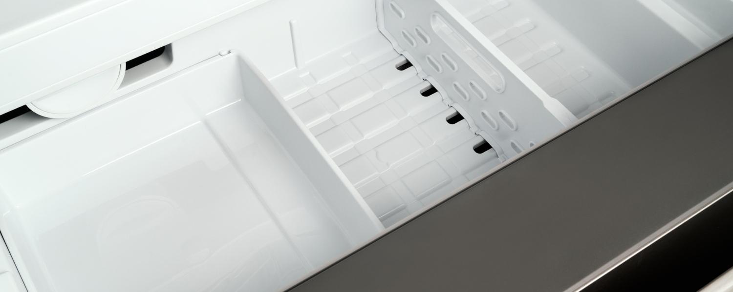 This counter-deep refrigerator has ample storage capacity, with 15.9 cubic feet of refrigerator volume and 6.6 cubic feet of freezer. Dual air-cooling flow with independent no-frost system for refrigerator and freezer compartments provide optimal temperature and humidity control to keep food fresher longer. The internal configuration of the upper compartment is designed for maximum flexibility, with shelves that move and fold, high-capacity drawers and crispers with dedicated humidity controls, and several gallon-size storage bins in both doors. Two freezer drawers allow easy access, and the top compartment holds the tray for the automated ice-maker.