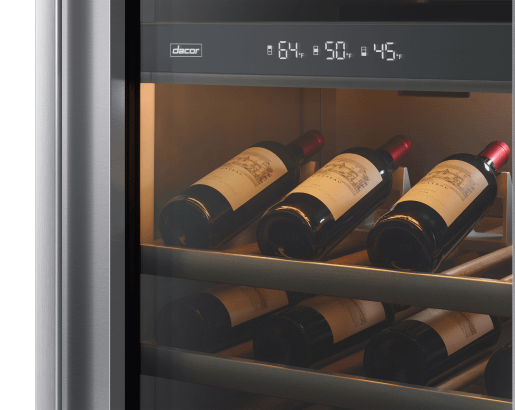 Dacor s fully integrated, full sized wine column easily holds up to 100 bottles of wine in three independently cooled zones, perfectly stored behind a triple layer of glass filled with argon gas to protect your wine collection from UV and IR rays. With a sleek design, the wine cellar comes panel-ready for graphite, stainless steel, or custom panels, with the option for a handle-free, push-to-open door. The column has four humidity sensors to perfectly control the humidity level between 50%-80%, while Dacor s own Precise Cooling Technology keeps temperature fluctuations within .3F. Receive notifications and real-time status of your collection through the IQ Connect WIFI system and SmartThings app.