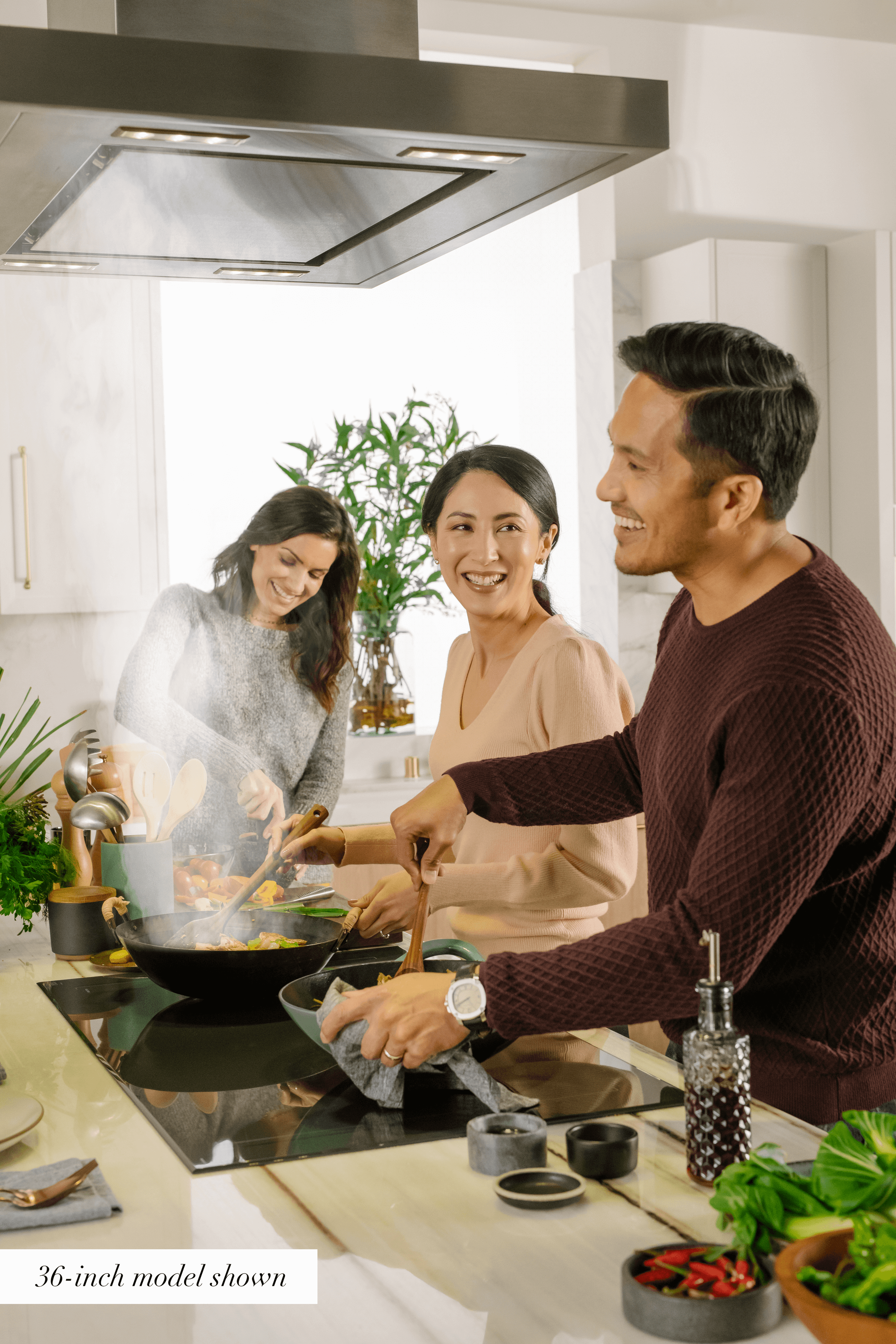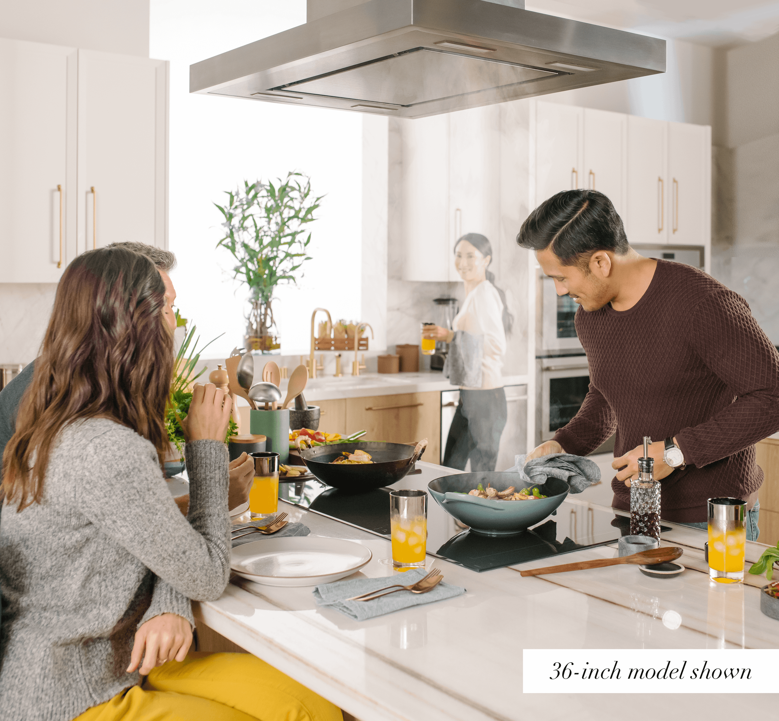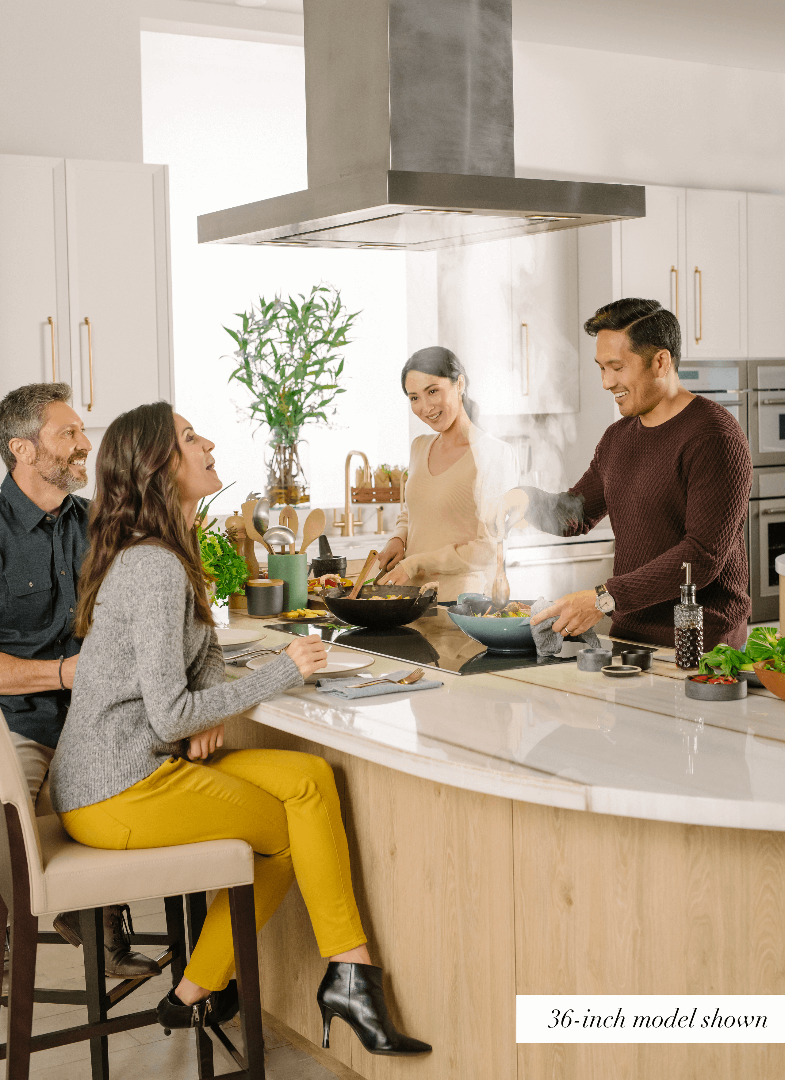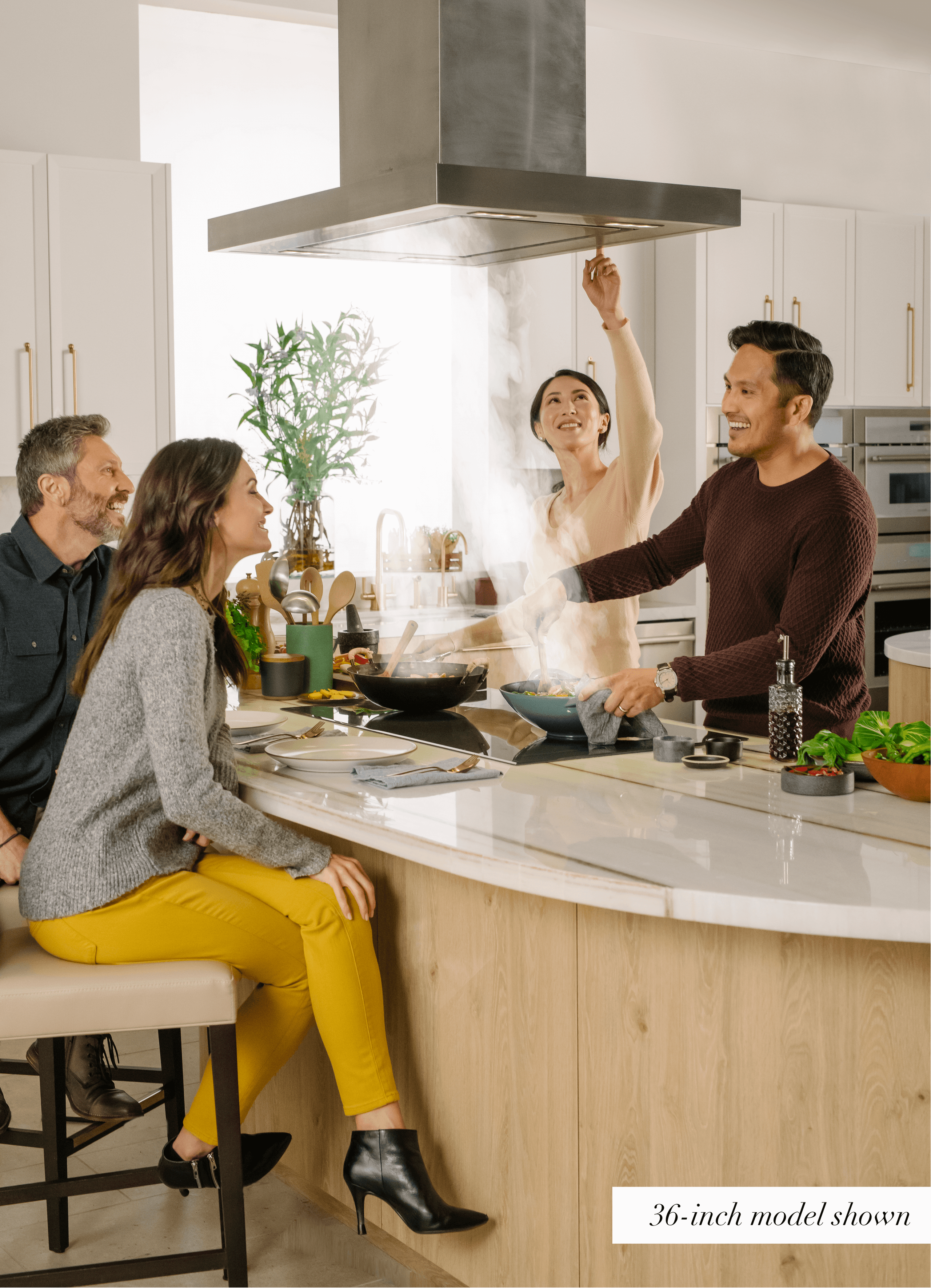 The island hood floats in the kitchen for a dynamic focal point.