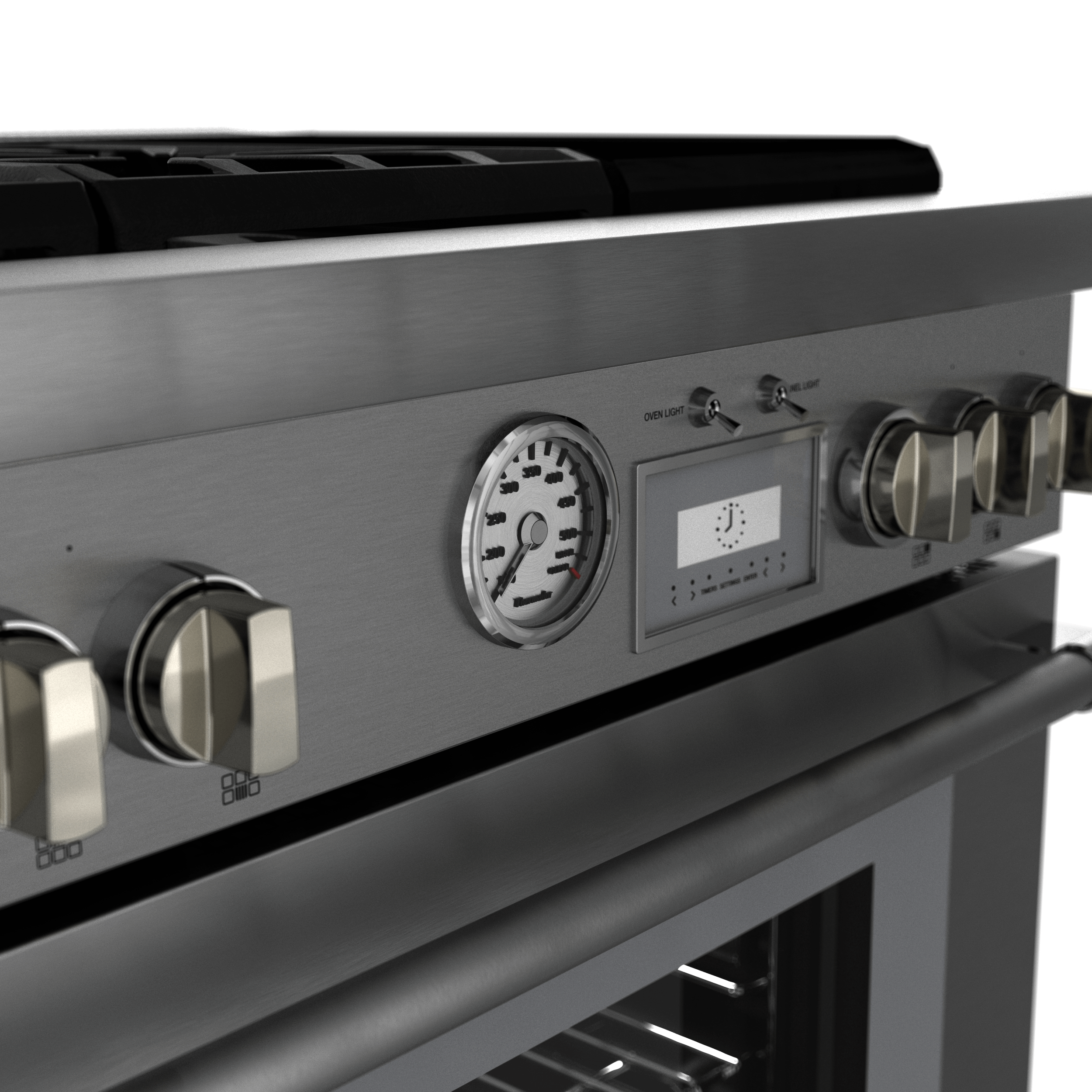 • The 36-inch Pro Grand commercial depth range is the perfect blend of professional grade cooking with a color Thin-Film Transistor interface. The multi-zone Liberty Induction module features two induction zones and HeatShift technology which automatically adjusts the heat when a pan is moved from one zone to another. The Patented Star Burner provides up to 22,000 BTU and is 56% longer than a round burner of the same size, enabling a superior flame spread for even heating and features a QuickClean Base designed for easy cleaning. The range is equipped with 4 Extralow Simmer burners that provide precise simmering capabilities. The multi-point temperature probe ensures precision and consistency when cooking and a two-hour self-cleaning mode reduces cleanup time. WiFi smart appliance capabilities include remote preheating and monitoring via Home Connect app.