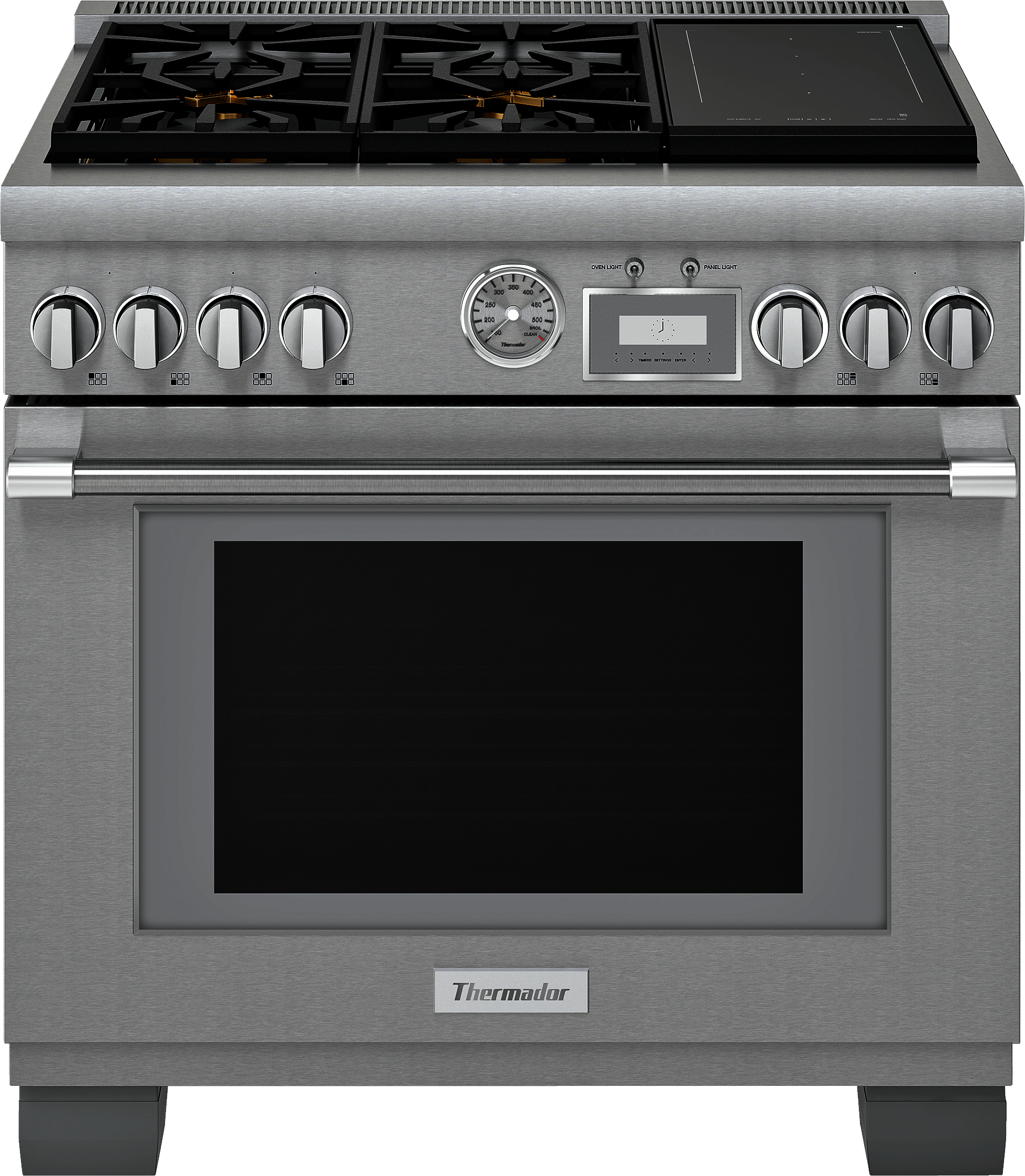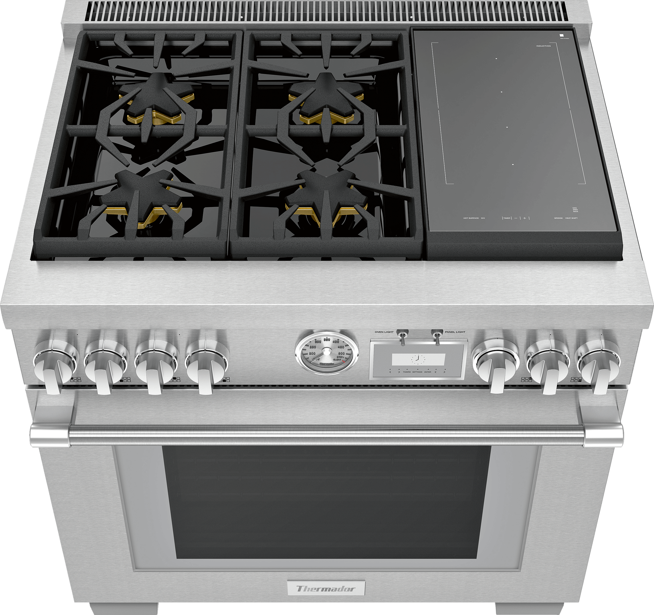 • The 36-inch Pro Grand commercial depth range is the perfect blend of professional grade cooking with a color Thin-Film Transistor interface. The multi-zone Liberty Induction module features two induction zones and HeatShift technology which automatically adjusts the heat when a pan is moved from one zone to another. The Patented Star Burner provides up to 22,000 BTU and is 56% longer than a round burner of the same size, enabling a superior flame spread for even heating and features a QuickClean Base designed for easy cleaning. The range is equipped with 4 Extralow Simmer burners that provide precise simmering capabilities. The multi-point temperature probe ensures precision and consistency when cooking and a two-hour self-cleaning mode reduces cleanup time. WiFi smart appliance capabilities include remote preheating and monitoring via Home Connect app. - 4 Star Burners