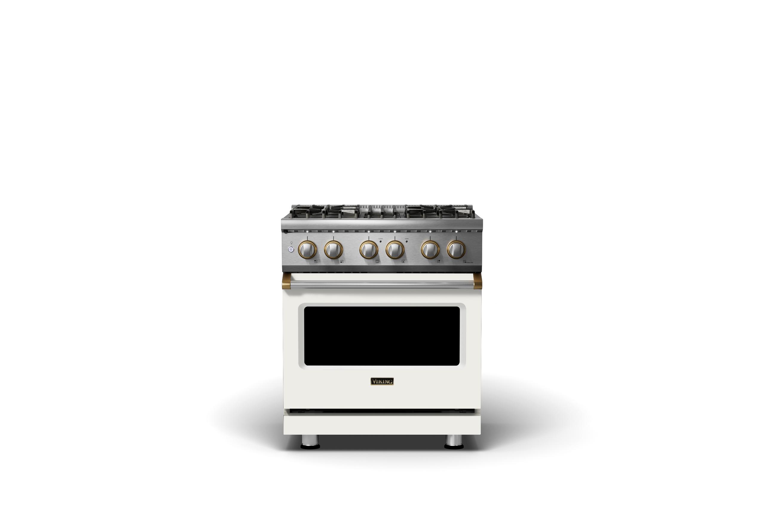 30"W. Dual Fuel Range {Finish=Pure White, Trim=Brushed Brass, Fuel=Natural Gas}