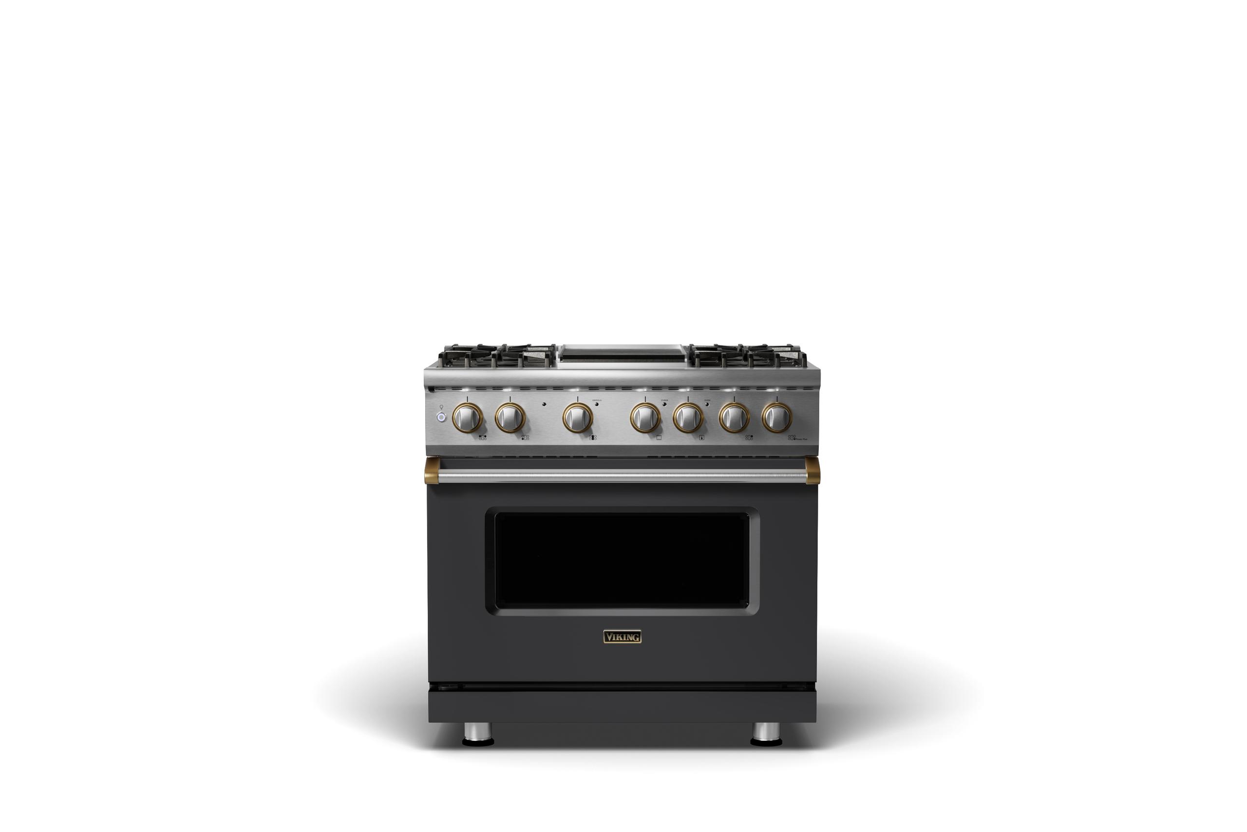 36"W. Dual Fuel Range {Burner=4g, Finish=Cast Black, Trim=Brushed Brass, Fuel=Propane}