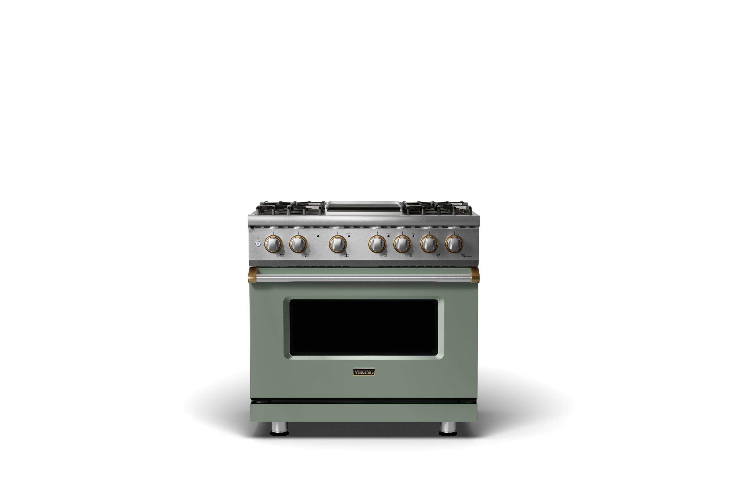 36"W. Dual Fuel Range {Burner=4g, Finish=Eucalyptus, Trim=Brushed Brass, Fuel=Natural Gas}