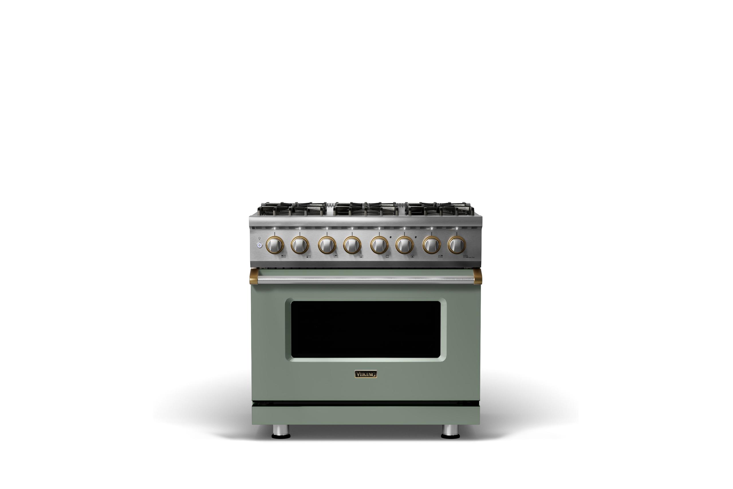 36"W. Dual Fuel Range {Burner=6b, Finish=Eucalyptus, Trim=Brushed Brass, Fuel=Natural Gas}