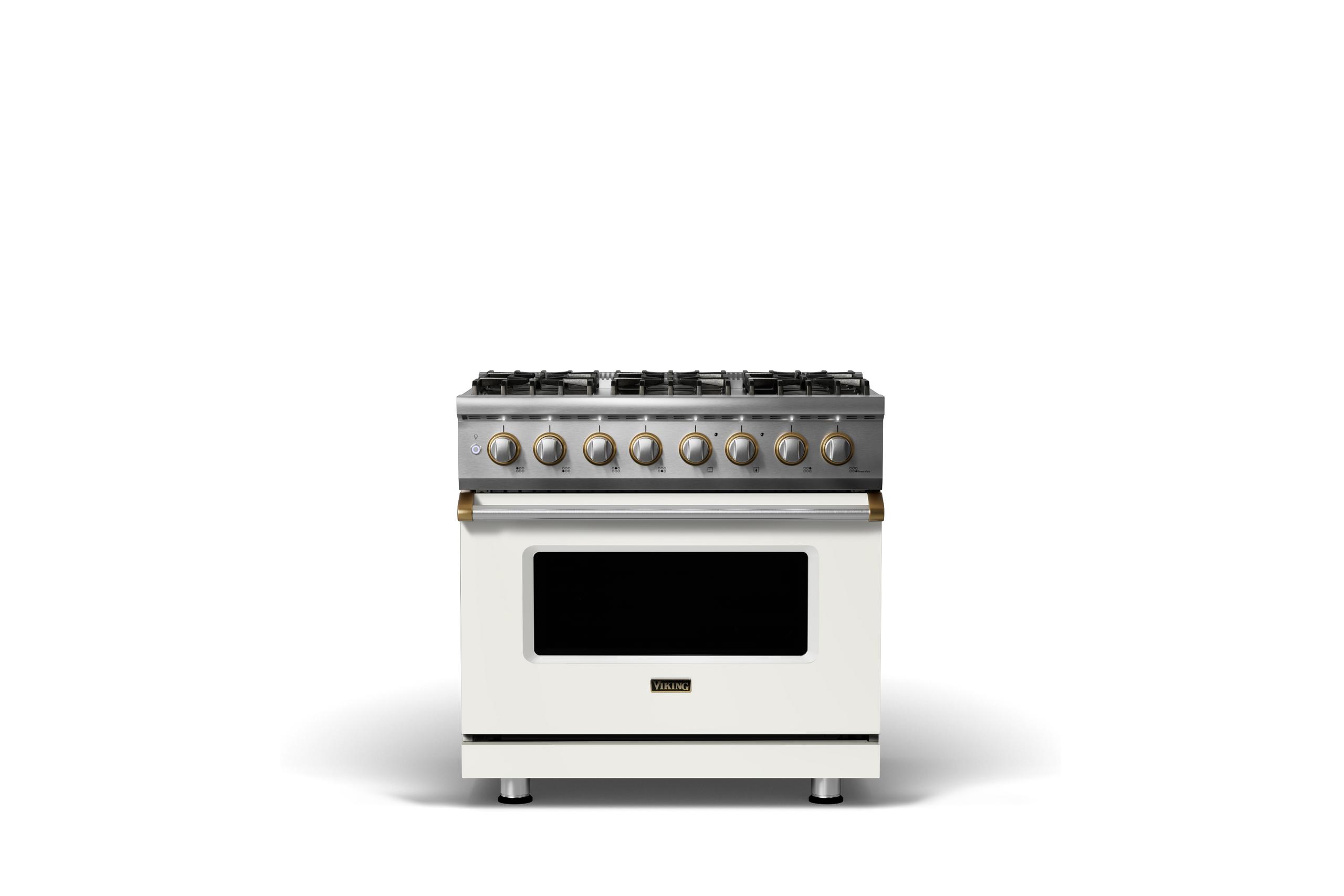 36"W. Dual Fuel Range {Burner=6b, Finish=Pure White, Trim=Brushed Brass, Fuel=Propane}
