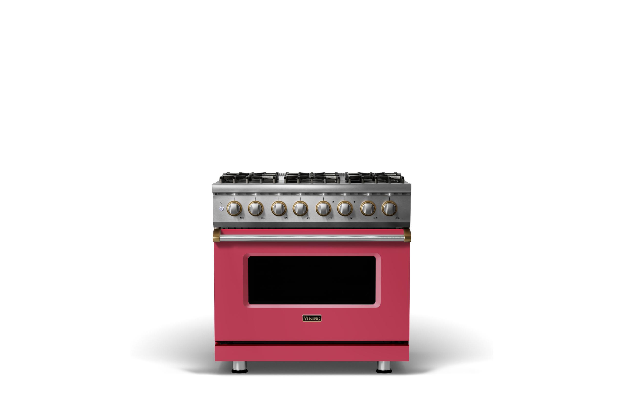 36"W. Dual Fuel Range {Burner=6b, Finish=Valentine, Trim=Brushed Brass, Fuel=Natural Gas}