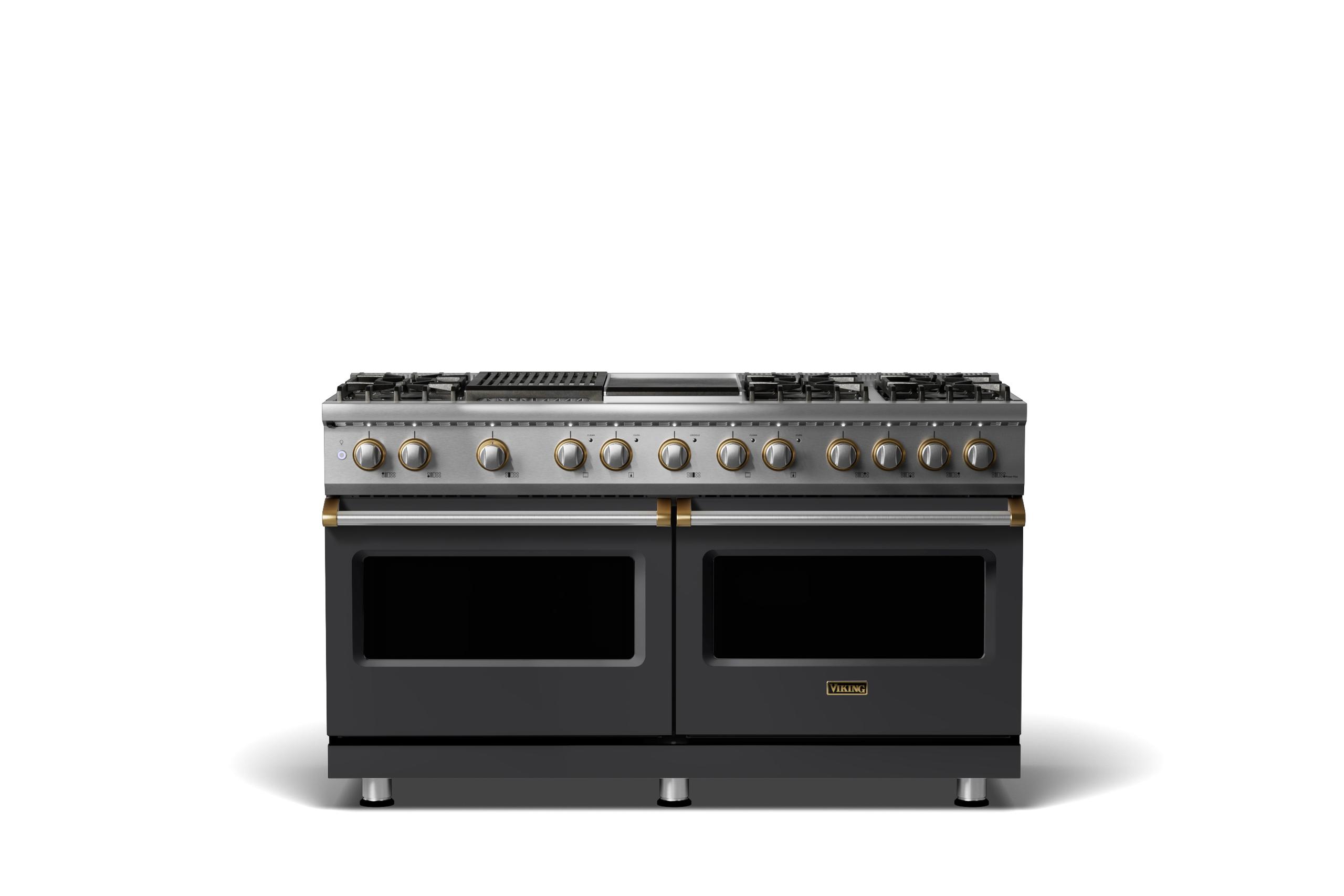 60"W.Dual Fuel Range {Finish=Cast Black, Trim=Brushed Brass, Fuel=Natural Gas}