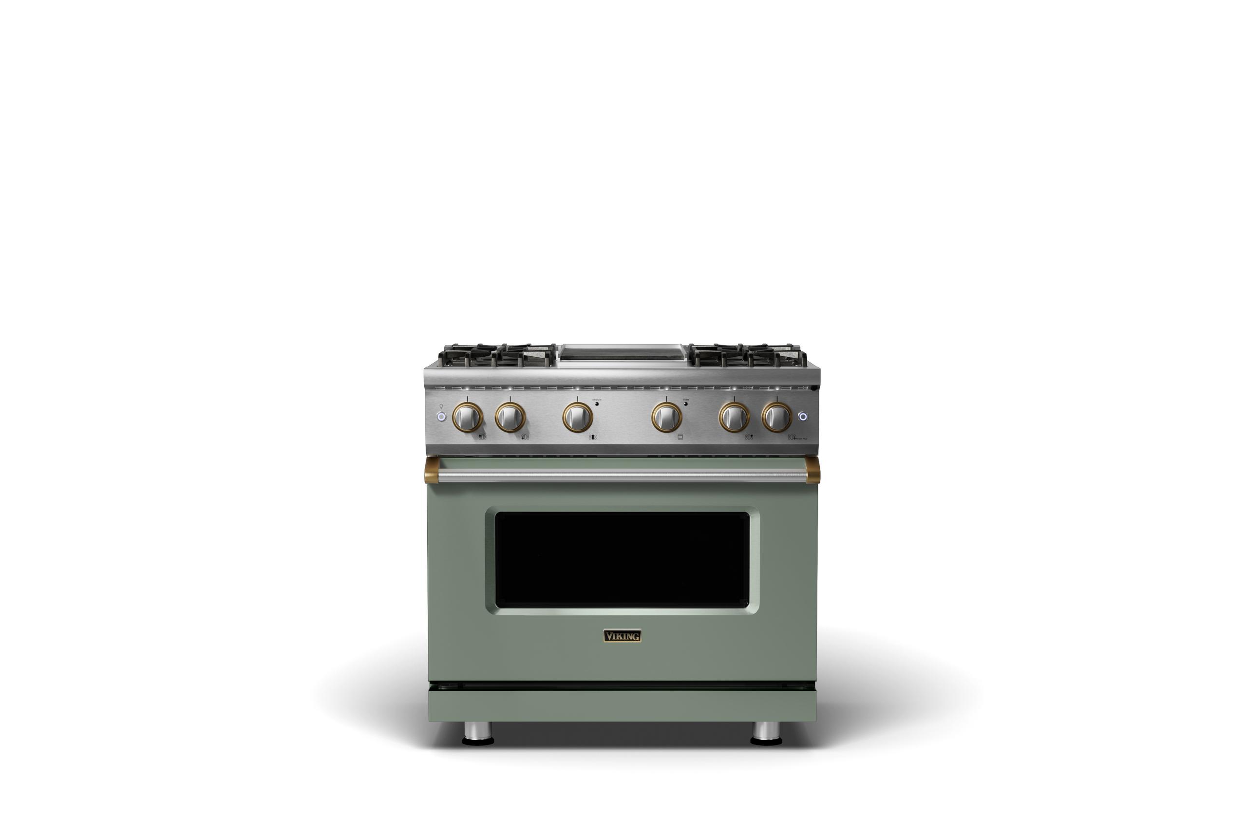 36"W. Sealed Burner Gas Range {Burner=4g, Finish=Eucalyptus, Trim=Brushed Brass, Fuel=Propane}