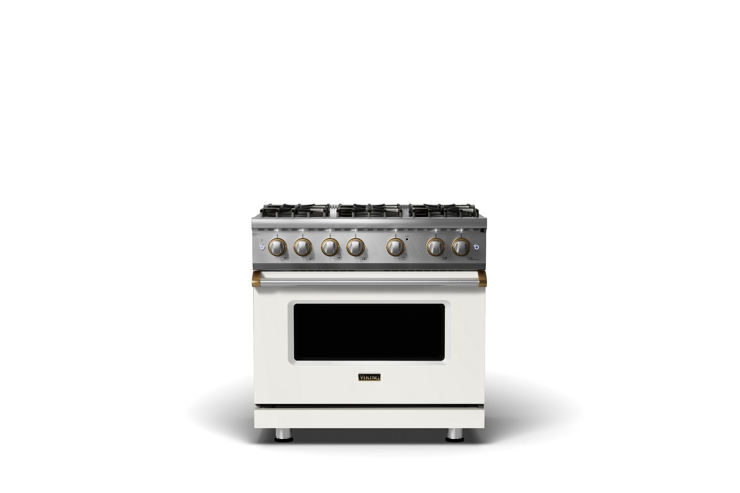 36"W. Sealed Burner Gas Range {Burner=6b, Finish=Pure White, Trim=Brushed Brass, Fuel=Natural Gas}