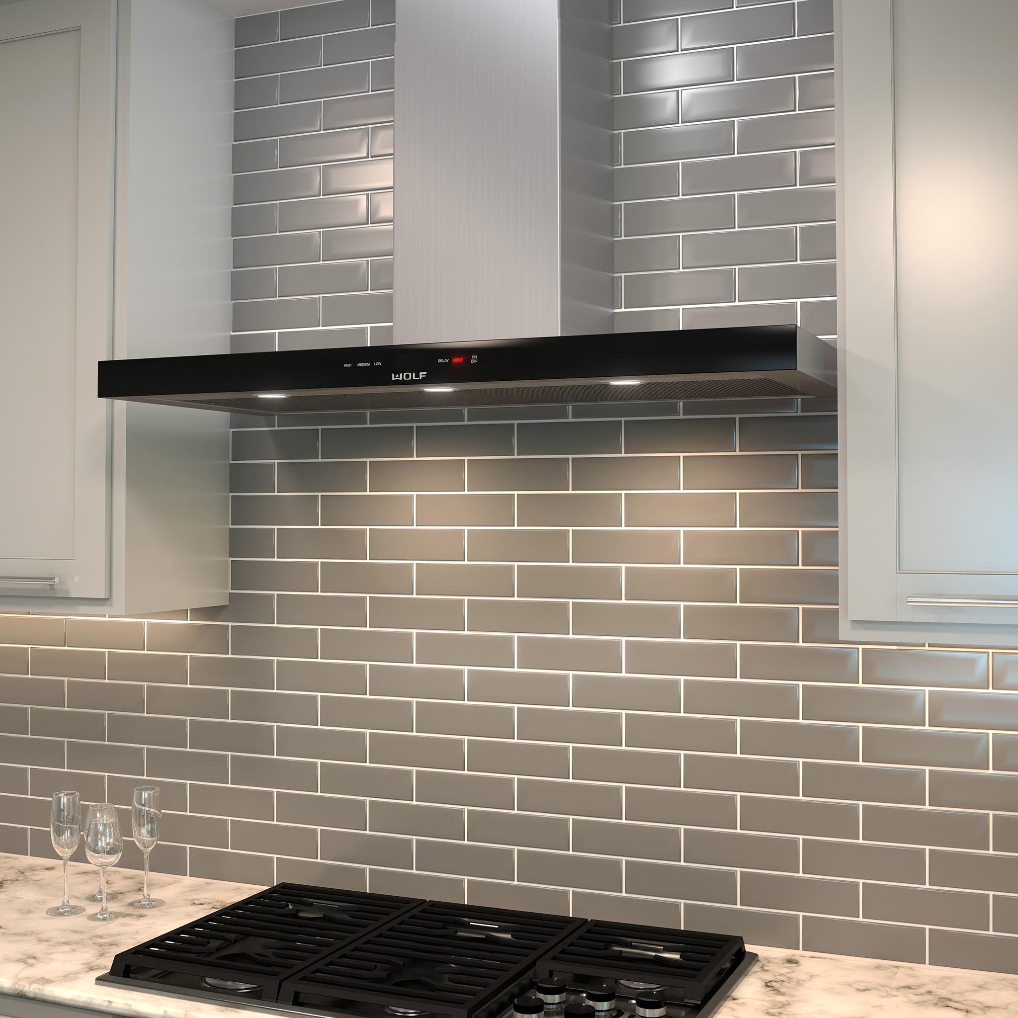 Coordinates with Wolf ovens and cooktops with its contemporary, low-profile, black glass look